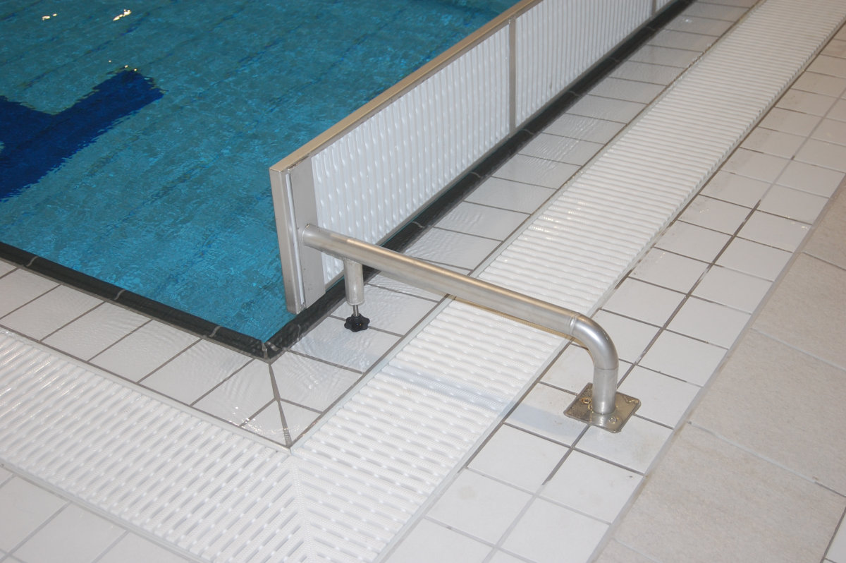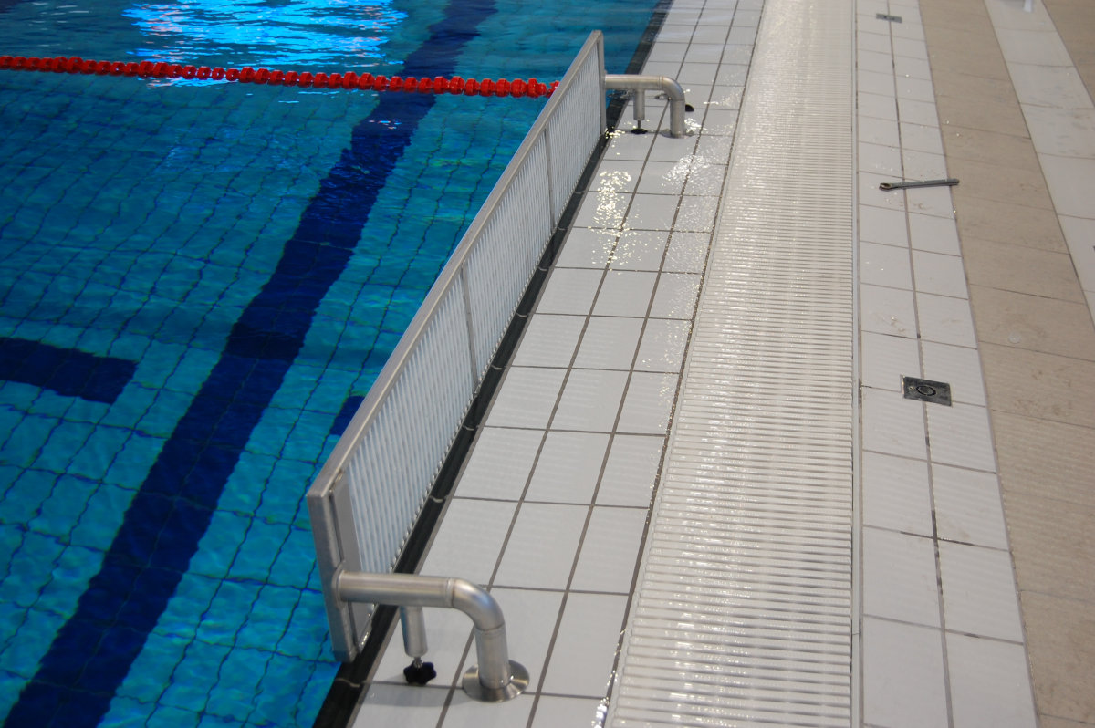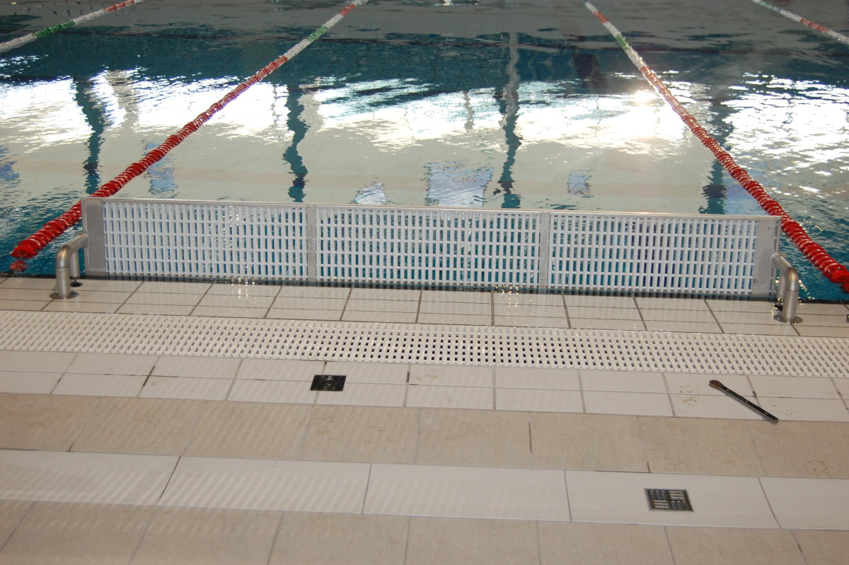 2500x300-as, saválló anyagból készült, elektropolírozott, műanyag uszodai ráccsal.